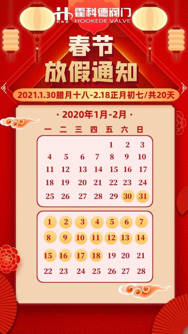 全體同事及客戶:一年一度的農歷春節已經臨近,在此感謝你們一年來辛勤地工作和長久的支持。因為有你們,霍科德才能砥礪前行和蒸蒸日上。在此,預祝全體同事新春愉快,萬事大吉!預祝全體客戶們吉祥如意,平安喜樂!2021年春節公司安排放假時間如下:很時期,請做好個人防護,勤洗手,多通風,少聚集,戴好口罩,遠離密集人群。衷心祝愿大家過一個歡樂、祥和的春節,牛年平安!